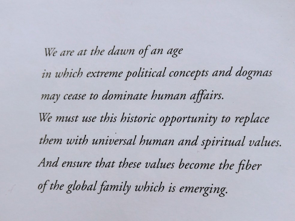 Nous devons saisir cette opportunité historique pour les remplacer par des valeurs humaines et spirituelles universelles et faire en sorte que ces valeurs deviennent la fibre de la famille mondiale qui émerge.